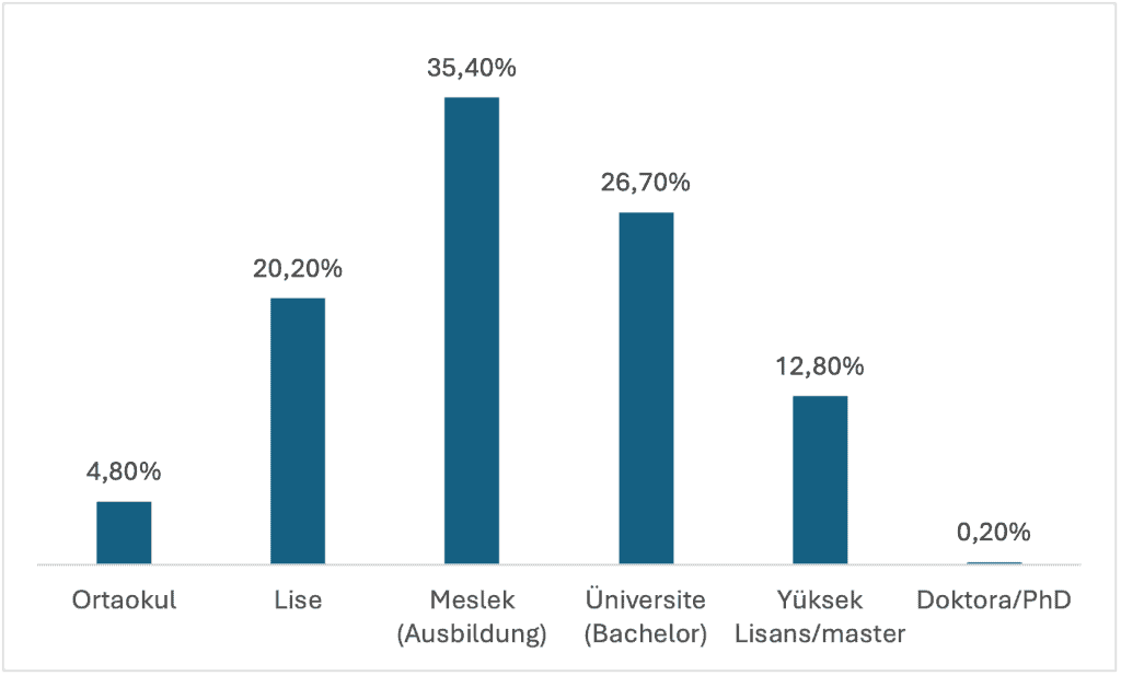 Araştırmanın en dikkat çekici sonuçlarından biri eğitim ve meslek alanında ortaya çıkıyor. Katılımcıların önemli bir bölümü yükseköğretim deneyimine sahip. Halen eğitimine devam edenlerin yüzde 39,2’si lisans, yüzde 11,3’ü yüksek lisans düzeyinde bulunuyor. Eğitimini tamamlayanlarda da meslek eğitimi, lisans ve lisansüstü düzeyler önceki kuşaklarla kıyaslandığında belirgin bir yükselişe işaret ediyor. Çalışanlar arasında yalnızca klasik işçi profili öne çıkmıyor; akademisyen, öğretmen, mühendis, finans çalışanı, sağlık personeli ve kamu görevlisi gibi nitelikli meslek grupları da geniş yer tutuyor.