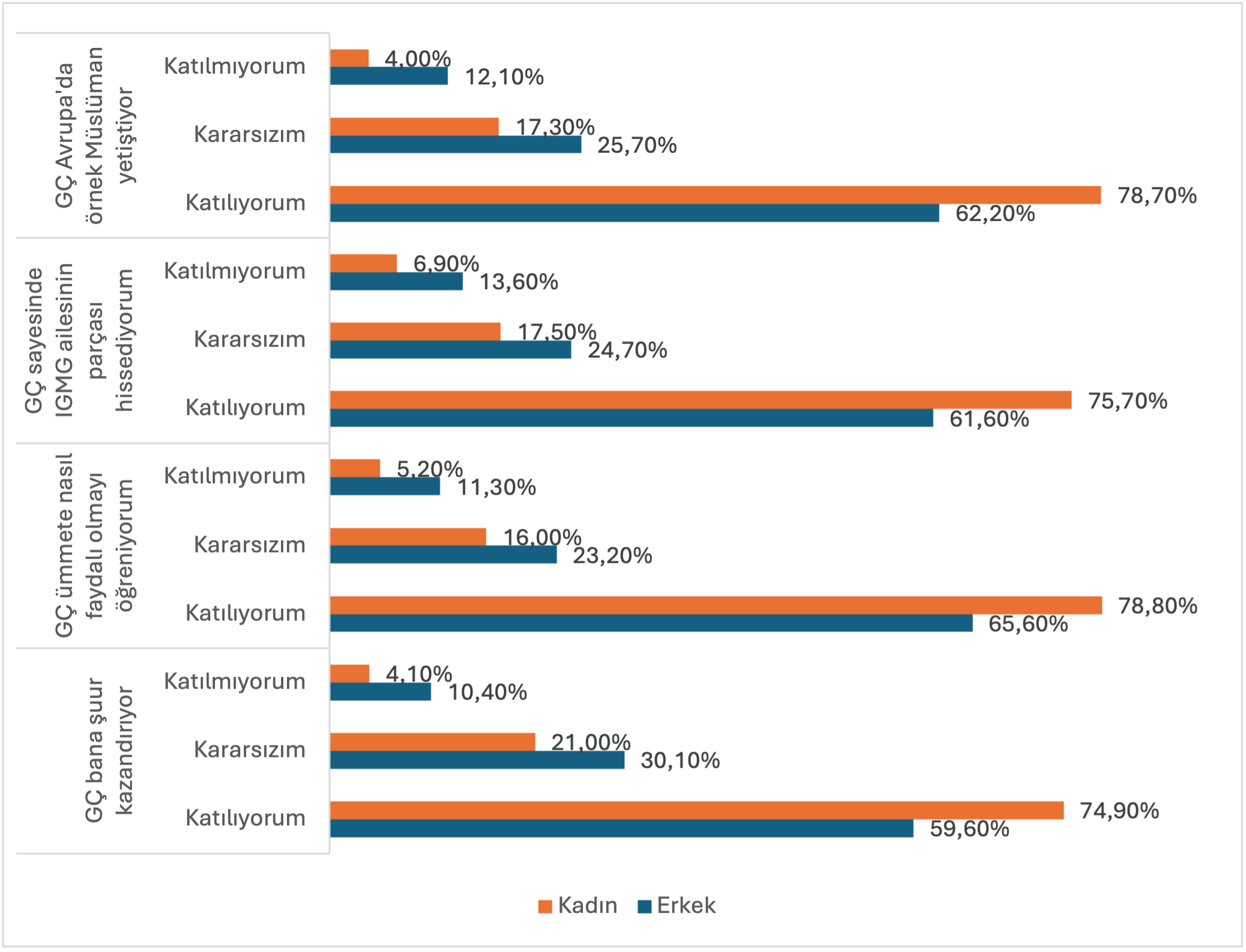 “Veriler, genç Müslüman kadınların hem eğitim düzeylerinin yüksek olduğunu toplumsal hayata katkı sağlama konusunda güçlü bir motivasyona sahip olduklarını gösteriyor. Kadınların birçok alanda erkeklerden daha fazla kamusal alanda yer alma motivasyonuna sahip olması, İslam’ın kadını kamusal alandan soyutladığı yönündeki varsayımı geçersiz kılmaktadır. Bu tablo, Müslüman kadının pasif ya da kamusal alandan dışlanmış olduğu yönündeki genellemelerin sahadaki gerçeklikle örtüşmediğini ortaya koyuyor.”