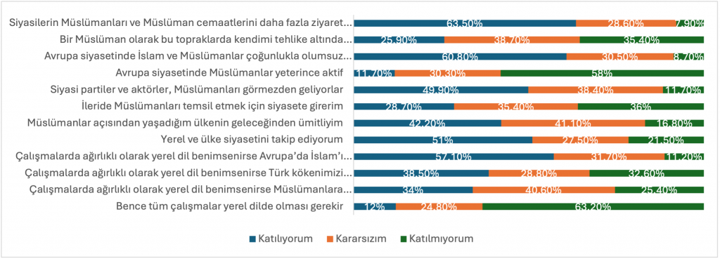 Bu tablo, Avrupa’daki Müslüman gençliğin yalnızca aidiyet geliştiren değil, aynı zamanda yaşadığı toplumu eleştirel bir gözle değerlendiren bir profil ortaya koyduğunu da gösteriyor. Gençler, siyasal aktörlerin kendilerini yeterince temsil etmediğini düşünürken, ayrımcılık ve önyargılara karşı daha kapsayıcı politikalar talep ediyor. Bu yönüyle ortaya çıkan profil, edilgen bir uyumdan ziyade; hak talep eden, kamusal alanda tanınma arayan ve mevcut düzeni sorgulayan bir nesle işaret ediyor.