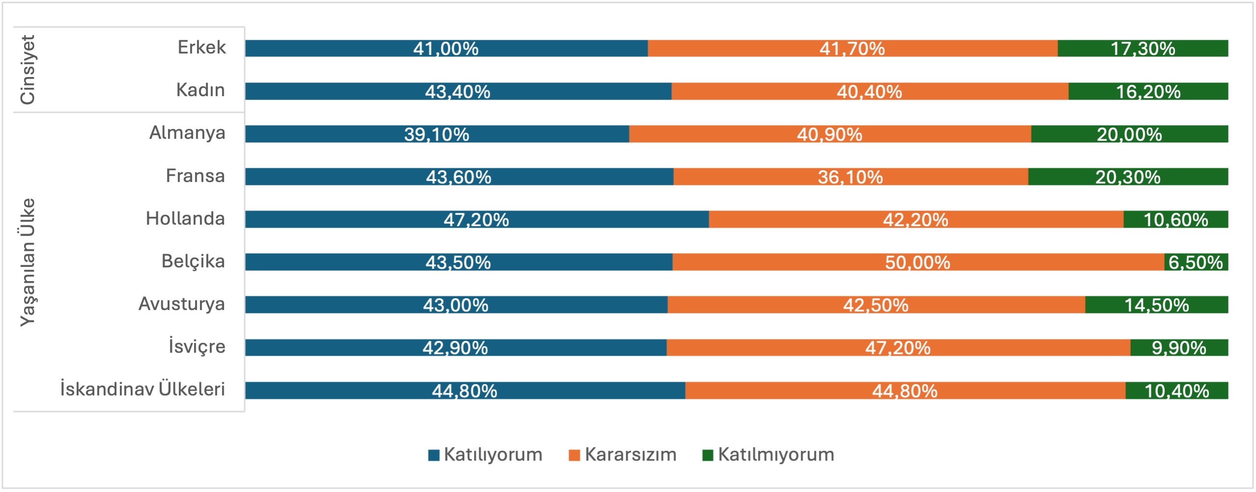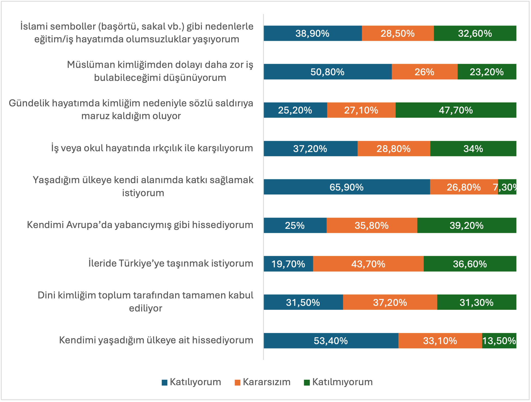Bu tabloya rağmen dikkat çekici olan, gençlerin kendilerini bütünüyle dışlanmış ya da kopmuş hissetmemesi. Araştırmada “Yaşadığım ülkeye ait hissetmiyorum” diyenlerin oranı yüzde 13,5’te kalıyor. Yüzde 53,40’ı yaşadığı ülkeye ait hissettiğini belirtirken, yüzde 33,10’u kararsız kaldığını ifade ediyor. Bu durum, tüm ayrımcılık ve tedirginlik deneyimlerine rağmen Avrupa’nın gençler için hâlâ kalıcı bir yaşam alanı olarak görüldüğüne işaret ediyor. Aynı şekilde, katılımcıların yüzde 65,9’unun yaşadığı ülkeye kendi alanında katkı sağlamak istediğini ifade etmesi ve Türkiye’ye taşınmayı düşünenlerin oranının yüzde 19,7 ile sınırlı kalması, bu kalıcılık duygusunu güçlendiren diğer göstergeler arasında yer alıyor.