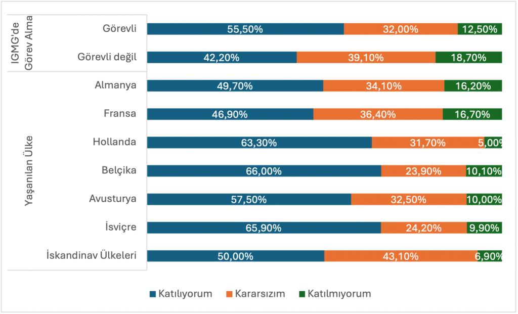 Grafik: IGMG teşkilatlarında görevli olma durumuna ve yaşanılan ülkeye göre “kendimi yaşadığım ülkeye ait hissediyorum” ifadesi